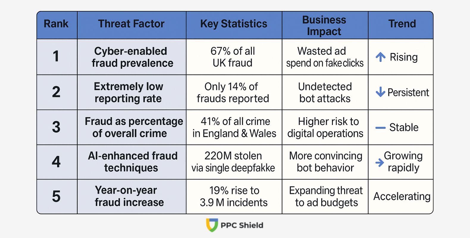 The National Crime Agency data shows that 67% of fraud reported in the UK is cyber-enabled, with attacks continuing to be driven by the abuse of online platforms. For businesses running pay-per-click campaigns, this translates to bot networks systematically generating false clicks that drain advertising budgets without producing legitimate leads or sales.